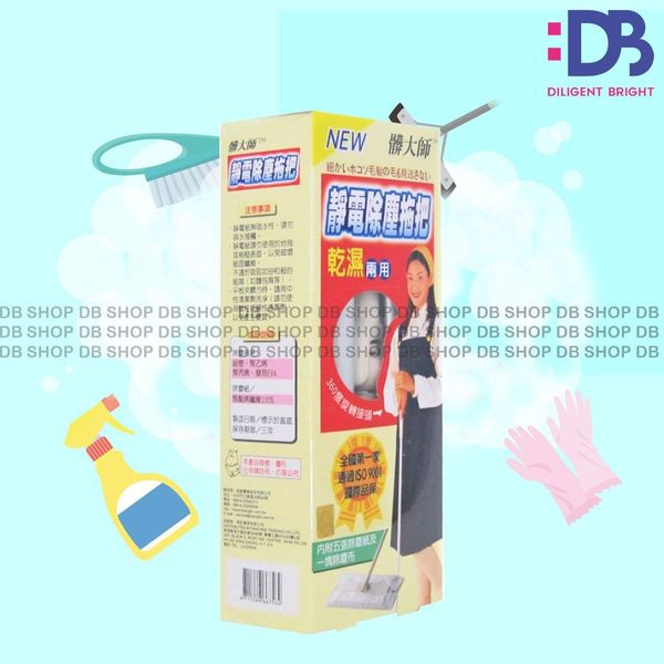 髒大師靜電除塵拖把套裝,可乾濕兩用。鋁管輕巧使用時輕鬆不費力,360度旋轉接頭及特設4節鋁管可適時加長,可方便不同家居地方清潔,如: 天花板、牆壁等灰塵,清潔無死角。靜電原理能迅速吸附細微的塵埃毛髮,家居清潔真正省時省力。